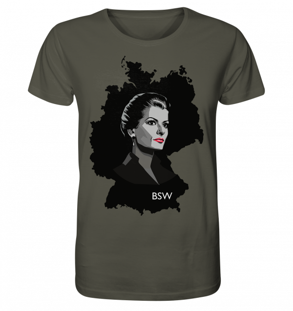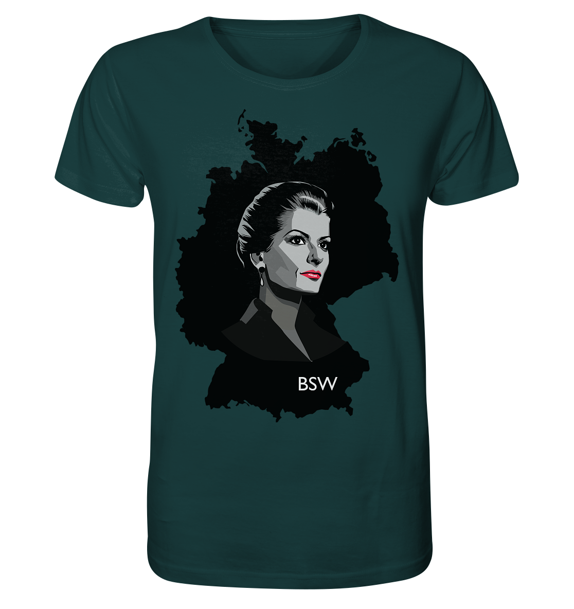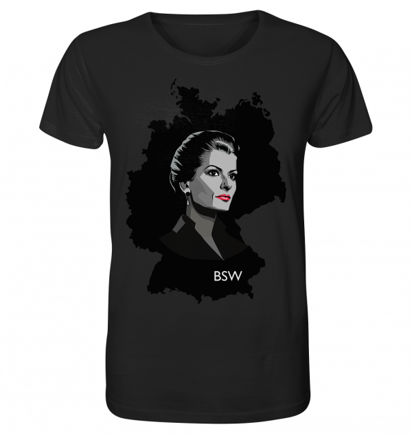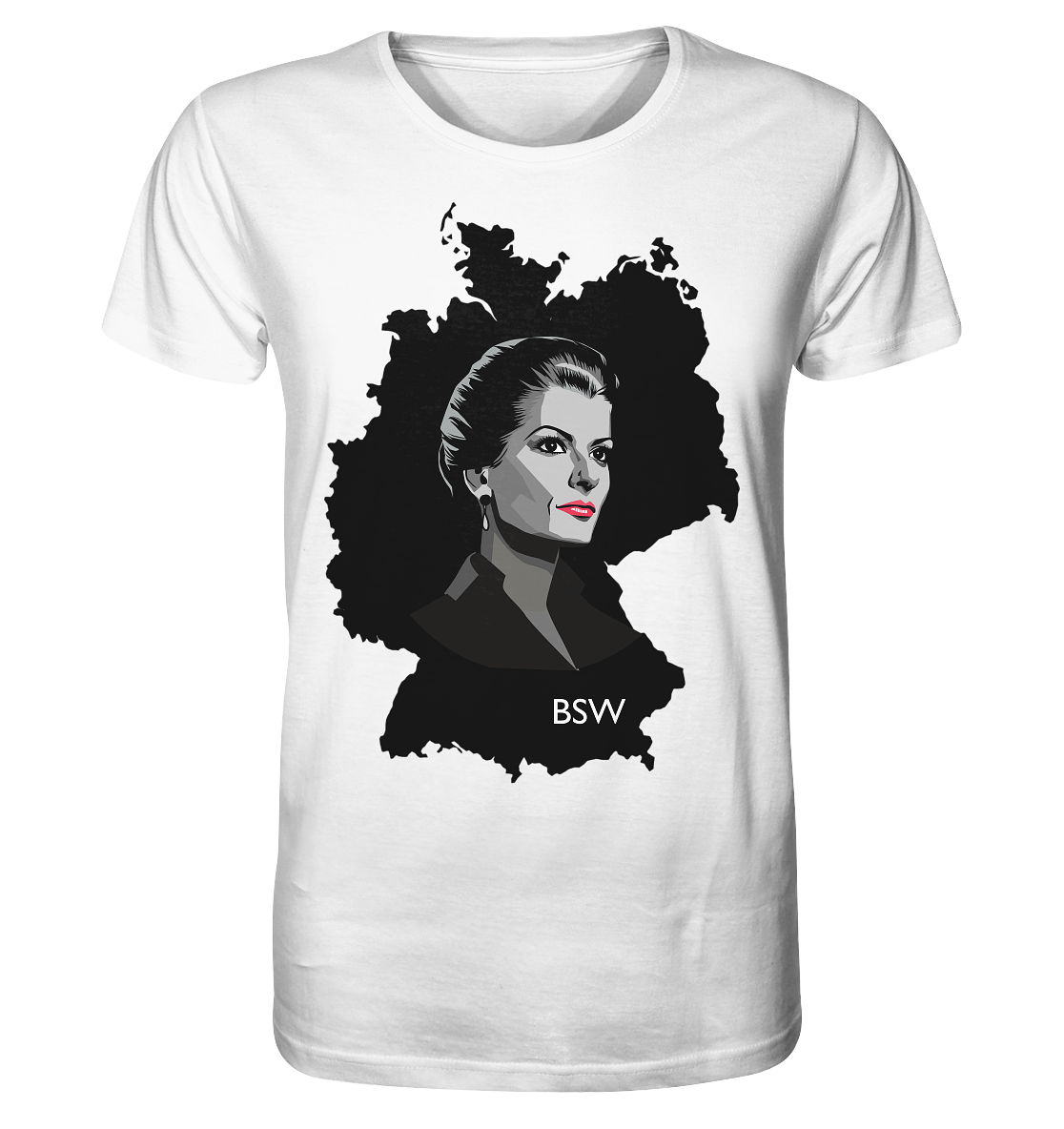 Einzigartiges Design: Die Verbindung von Wagenknechts Portrait mit der Deutschland-Silhouette macht dieses T-Shirt zu einem visuellen Highlight.