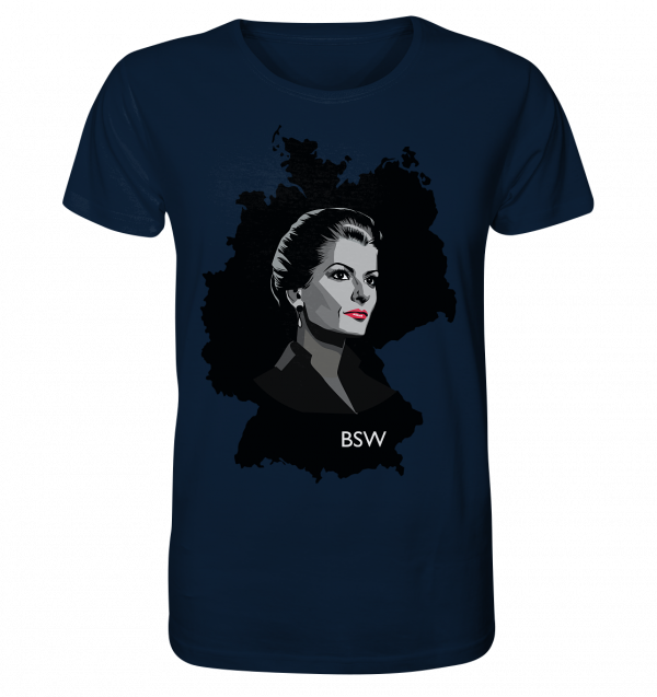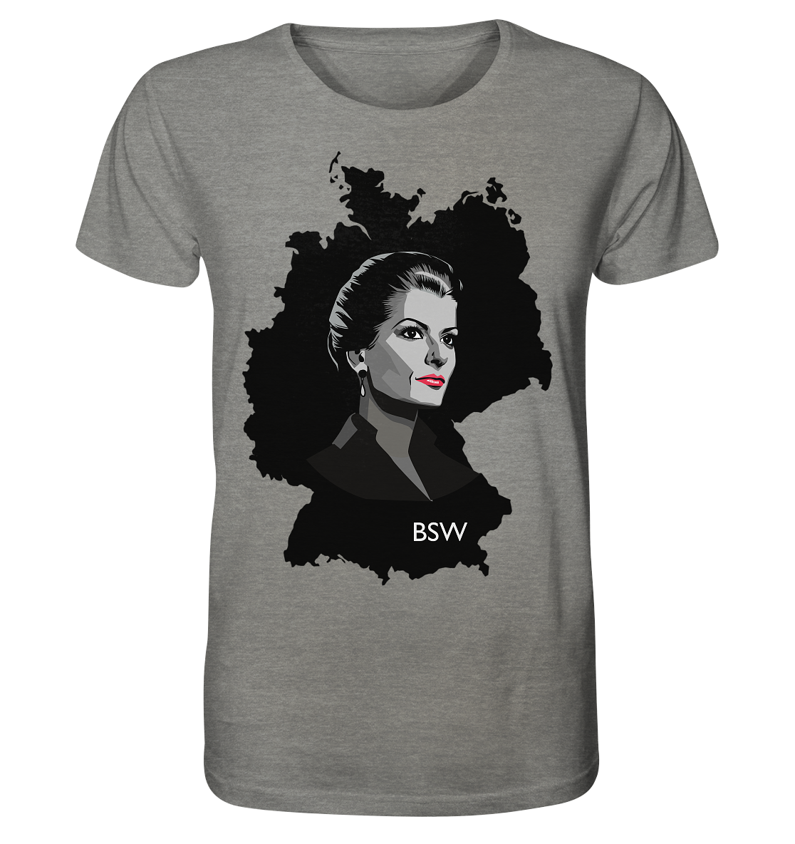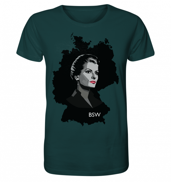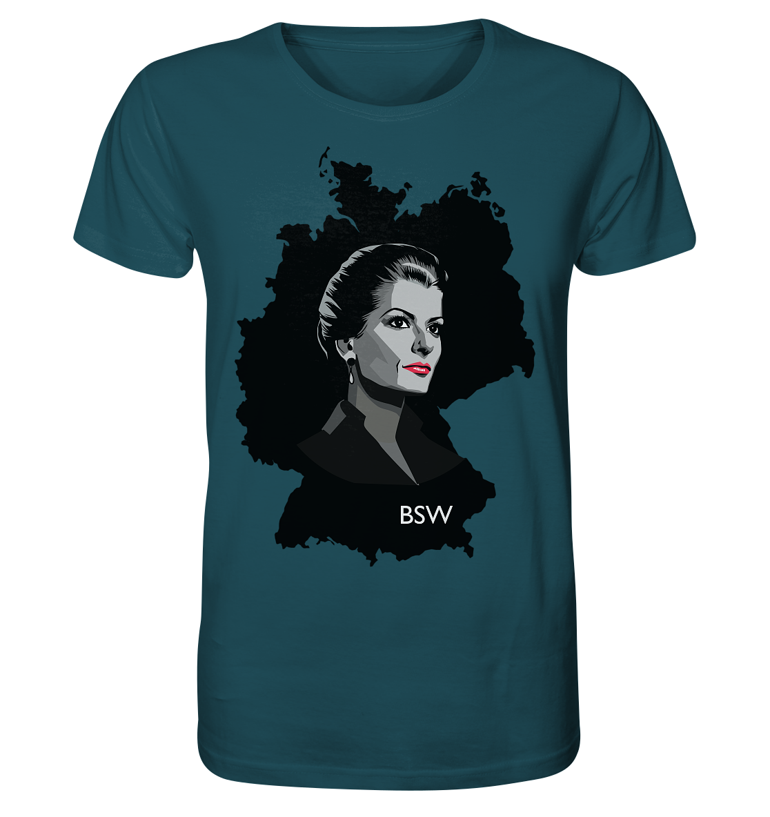 Einzigartiges Design: Die Verbindung von Wagenknechts Portrait mit der Deutschland-Silhouette macht dieses T-Shirt zu einem visuellen Highlight.